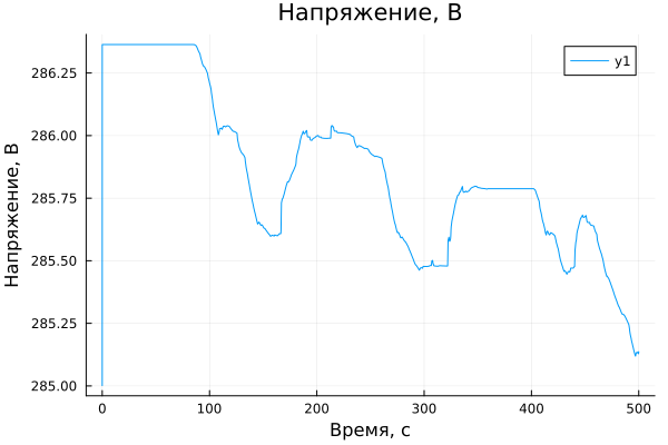 plot!(title = "Напряжение, В", ylabel = "Напряжение, В", xlabel="Время, c")