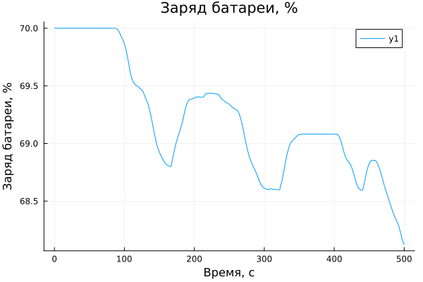 plot!(title = "Заряд батареи, %", ylabel = "Заряд батареи, %", xlabel="Время, c")