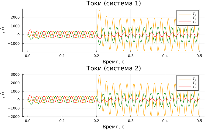 title = "Токи (система 1)", ylabel = "I, А", xlabel="Время, c");