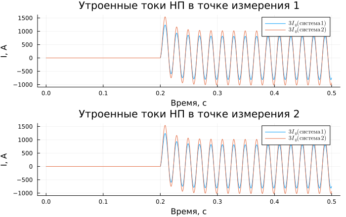 p1 = plot(sim_time, [i_1mut[:,4] i_1[:,4]], label = [L"3I_0(система\,1)" L"3I_0(система\,2)"],