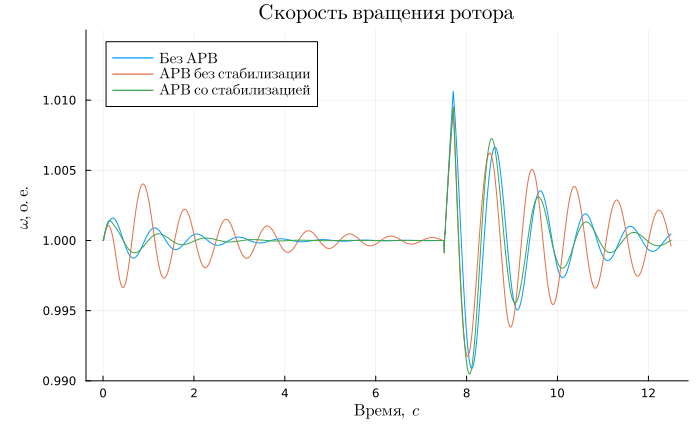 plot(sim_time, w1, title = L"Скорость\; вращения\; ротора", ylabel = L"\omega, о.е.", xlabel=L"Время,\; c", label = L"Без\; АРВ", legendfontsize = 10)