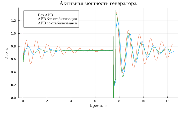 plot!(sim_time, P2, label = L"АРВ\; без\; стабилизации", legendfontsize = 10, size = (700,440), left_margin=5Plots.mm, bottom_margin=5Plots.mm)