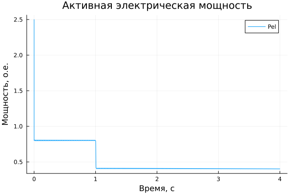 plot!(title = "Активная электрическая мощность", ylabel = "Мощность, о.е.", xlabel="Время, c")