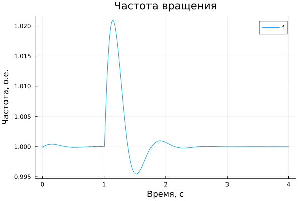 plot!(title = "Частота вращения", ylabel = "Частота, о.е.", xlabel="Время, c")